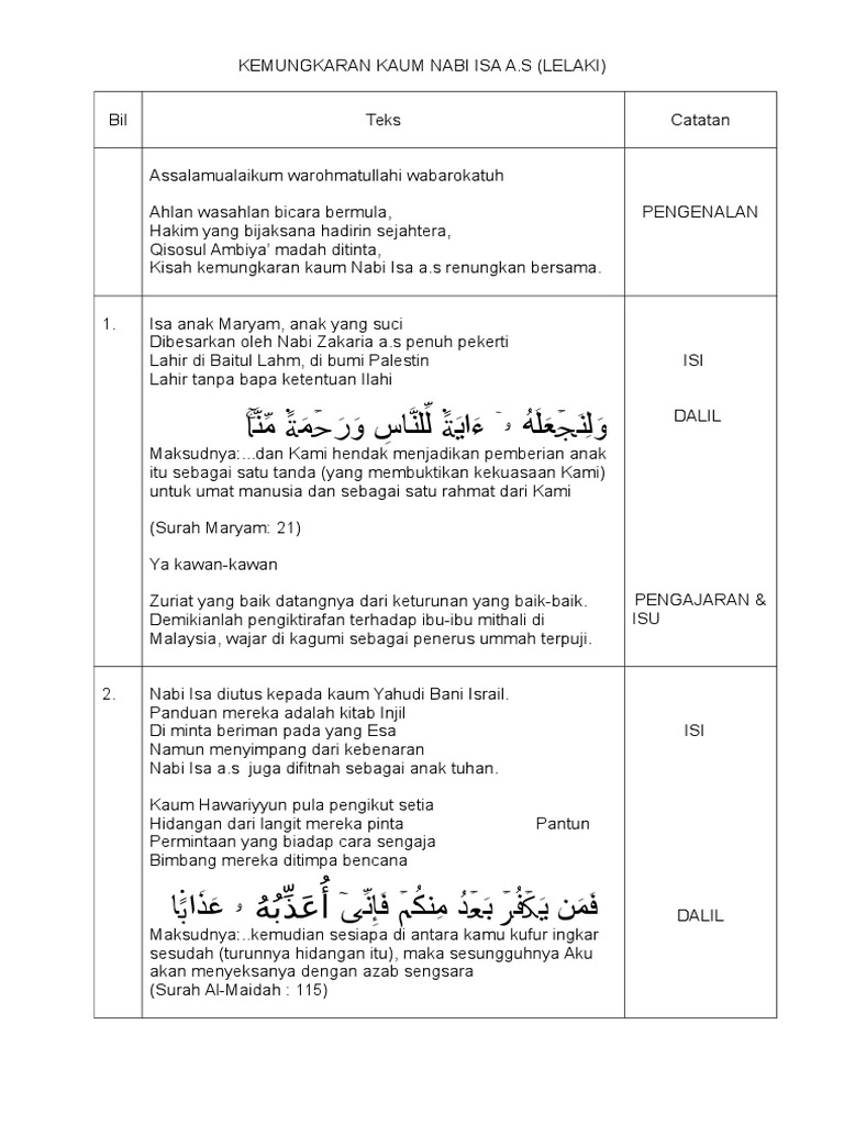Terutama mengenai wafat dan kedatangannya di dunia pada akhir zaman. Isa (عيسى) merupakan seorang nabi yang penting dalam agama islam. Ibunya bernama maryam dan tidak mempunyai ayah, beliau dilahirkan atas kehendak dan kuasa allah swt. Nabi isa as merupakan salah satu dari sebagian dua puluh lima nabi dan rasul allah swt beliau juga termasuk dalam golongan ulul azmi. Berdasarkan ayat itu islam yakin isa lahir tanpa bapak jasmaniah. Meskipun saat itu umat yahya sangat besar dan banyak namun tetap saja ia rendah hati dan tak mau. Dari nabi ibrahim, lahir keturunan para nabi dan rasul. Di bawah temaramnya sinar bintang, maryam kemudian memeluk bayinya dengan perasaan gembira. Demikianlah dukungan yahya terhadap isa. Apalagi, hanah sangat berharap garis keturunan nabi sulaiman alaihissalam tidak terputus dengan keduanya berdoa kepada allah, sebagai bentuk kepasrahan agar anak yang telah lahir itu dijauhi dari gangguan setan. Kemudian, nabi isa membentuk tanah serupa dengan burung. Penutur ulang lukman hakim zuhdi. Orang yahudi tidak membunuh beliau dan tidak menyalib beliau.